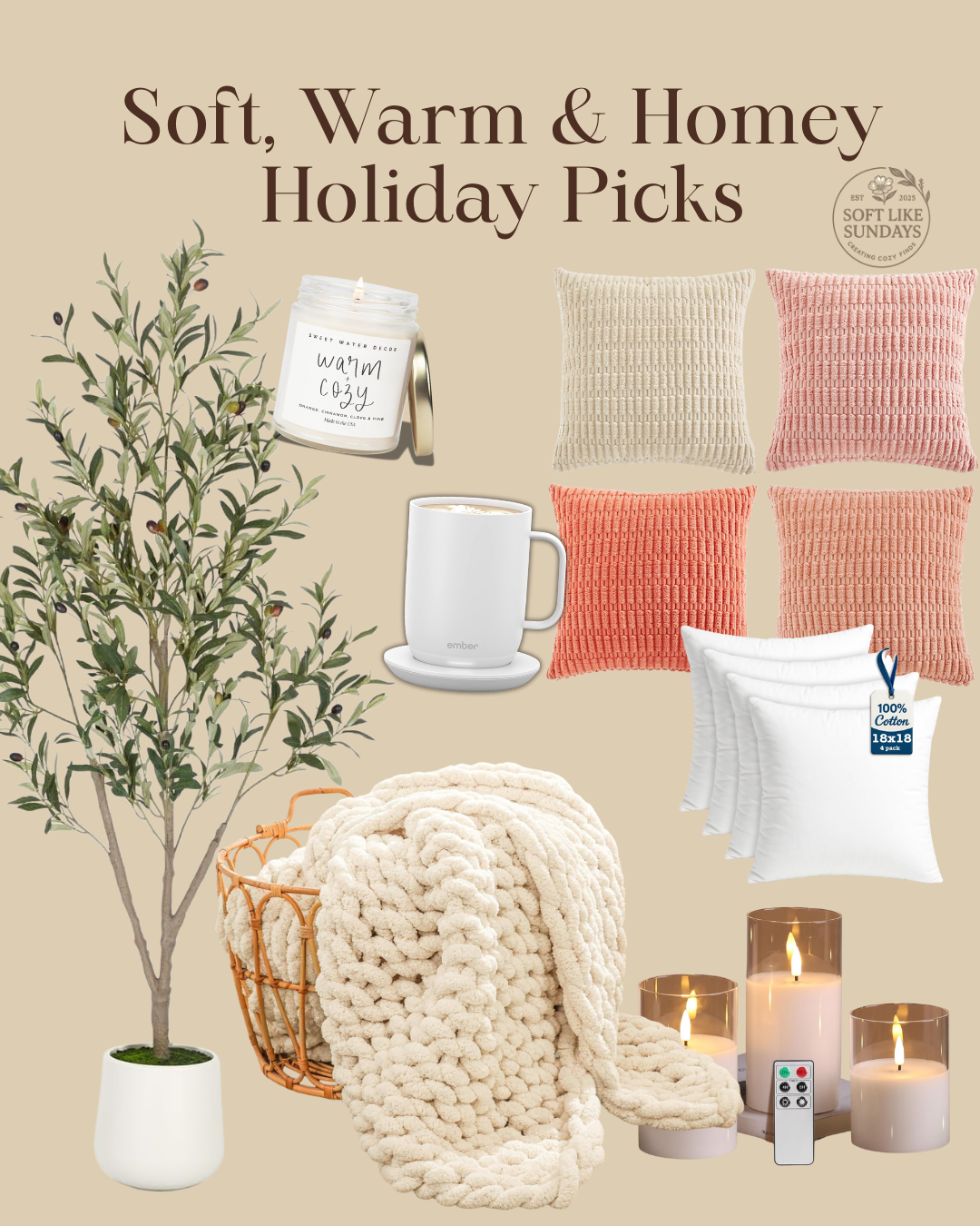Olive Tree • Warm & Cozy Candle • Temperature-Control Mug • Textured Knit Pillow Covers • 18x18 Pillow Inserts• Chunky Knit Blanket • Flameless LED Candles